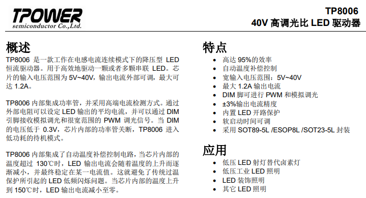 TP8006 內(nèi)部集成了自動溫度補(bǔ)償控制電路,電壓范圍為 5V~40V,輸出電流外部可調(diào),最大可達(dá) 1.2A 一手廠家黃先生1798794877