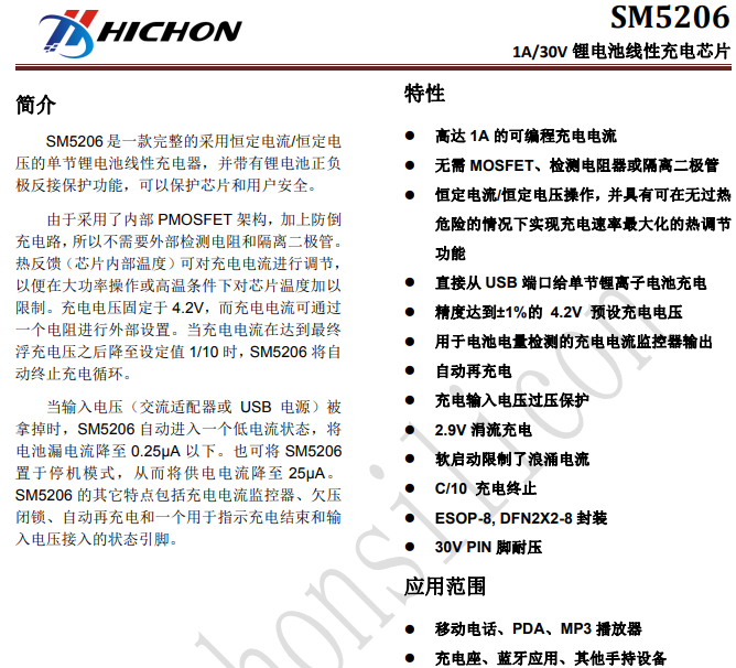 SM5206 是一款完整的采用恒定電流/恒定電壓的單節鋰電池線性充電器,并帶有鋰電池正負極反接保護功能,可以保護芯片和用戶安全。 由于采用了內部 PMOSFET 架構,加上防倒充電路,所以不需要外部檢測電阻和隔離二極管,熱反饋(芯片內部溫度)可對充電電流進行調節,以便在大功率操作或高溫條件下對芯片溫度加以限制。充電電壓固定于 4.2V,而充電[/url][url=http://m.4huy16.com/keyword/%E7%94%B5%E6%B5%81]電流可通過一個電阻進行外部設置。當充電電流在達到最終浮充[/url][url=http://m.4huy16.com/keyword/%E7%94%B5%E5%8E%8B]電壓之后降至設定值 1/10 時, SM5206 將自動終止充電循環。當輸入電壓[/url](交流適配器或 USB 電源)被拿掉時,SM5206 自動進入一個低電流狀態,將電池漏電流降至 0.25μA 以下。也可將 SM5206置于停機模式,從而將供電電流降至25μA。SM5206 的其它特點包括充電電流監控器、欠壓閉鎖、自動再充電和一個用于指示充電結束和輸入電壓接入的狀態引腳。 一手廠家 軟硬件技術支持開發 13798794877黃 |