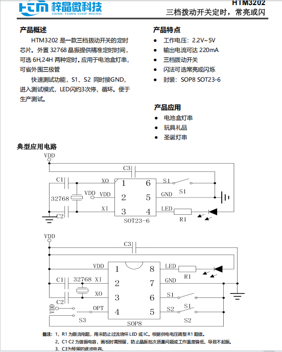 HTM3202 是一款三檔撥動開關(guān)的定時 電池盒芯片。外置 32768 晶振提供精準(zhǔn)定時時間, 可選 6H,24H 兩種定時