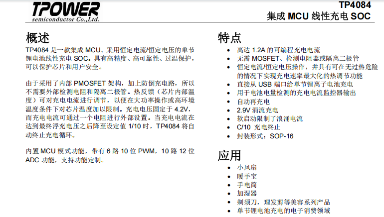 TP4084作為一款集成可編程MCU的線性充性SOC,不僅提供了高達(dá)1.2A的充電性能,更以其深度定制能力和模塊化設(shè)計