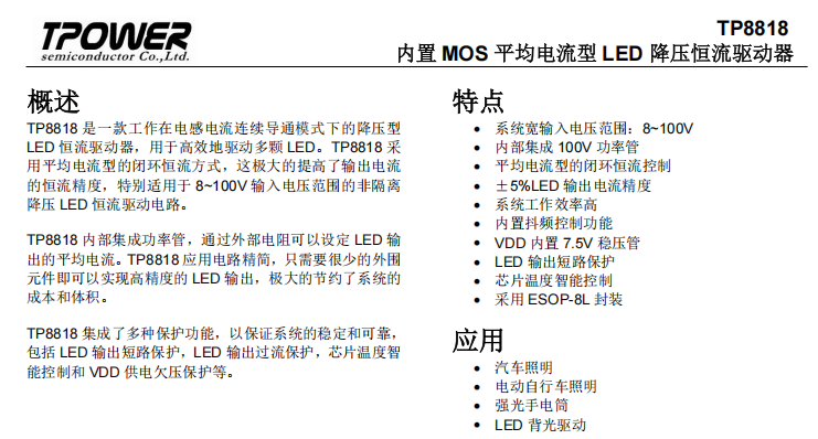 出的平均電流。TP8818 應(yīng)用電路精簡,只需要很少的外圍