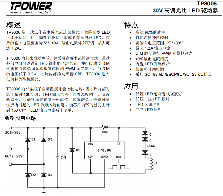 天源TP8006 40V 高調(diào)光比 LED 驅(qū)動器 方案應(yīng)用等技術(shù)