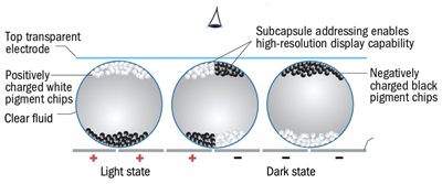 E Ink's patented electrophoretic display sandwiches its microcapsules of oppositely charged black and white pigments in a fluid between two polymers. When a voltage is applied at a pixel location, its polarity attracts either the black or the white pigment to the backplane. Grayscales are represented by mixing some white microcapsules with some black ones. After power is removed, the page remains displayed because the microcapsules are bistable and will hold their position indefinitely. Proprietary process