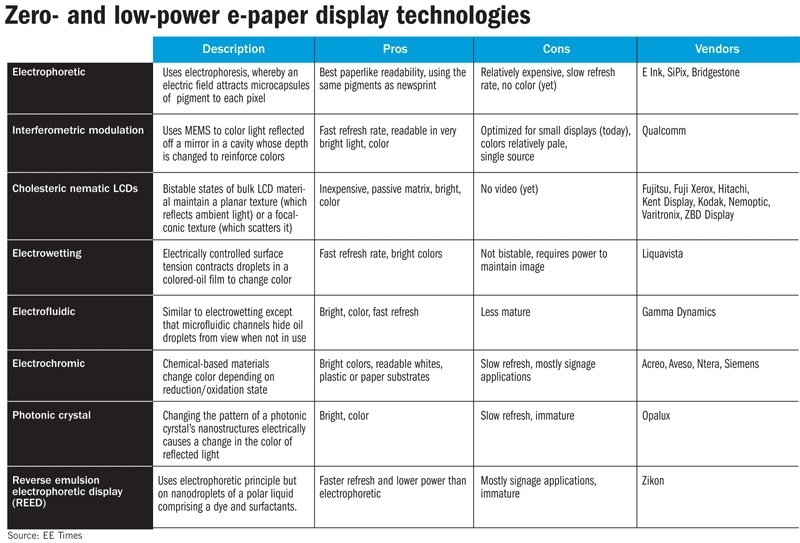 The stakes are high for the e-paper competitors vying to break E Ink's virtual monopoly on the market. Research firm iSuppli predicts that the market for zero- and ultralow-power e-paper displays will top $516 million by 2012. With shipments slated to pass the 10 million-unit mark this year, vendors are scrambling to line up mass-production capabilities to rival E Ink's, but at a lower cost to OEMs, while they simultaneously claim to be adding color and video capabilities. "E Ink is the favorite son today for the low-power market. But when worldwide volumes hit the 10 million-unit mark sometime later this year, investors are going to start seeing that all sorts of other possibilities begin to make sense," said Envisioneering's Doherty. "A year from now, E Ink is going to have a lot of competition; 2010 is going to be the year of shakeouts." LCD manufacturer Primeview International bought E Ink last year and has licensed its process to Chi Mei Optoelectronics and LG Display Co. Ltd. The deals bring E Ink plenty of capacity to meet demand in expanding consumer markets. Matching E Ink's production capability, but without announced design wins, is SiPix, which was purchased last year by LCD panel manufacturing giant AU Optronics Corp. "SiPix/AUO is an electrophoretic alternative to E Ink," said Gartner's Tang. "I foresee that SiPix will stimulate E Ink to enlarge their scale of production even further by strategically partnering with other LCD fabs, and as a result supply will become more stable and prices will go down."