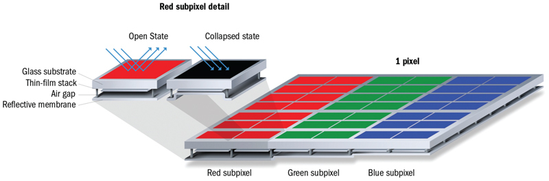 Mirasol uses an optically resonant cavity housing a Fabry-Perot interferometer, consisting of a thin-film stack and a deformable reflective membrane. Normal ambient light reflects off both the thin-film stack at the top of the cavity and the reflective membrane at the bottom. Phases are controlled to reinforce specific colors selectively, thereby yielding light amplification without any filters or polarizers to cut down on the reflected light. That eliminates the need for a backlight. The display can be sidelit for reading in the dark.