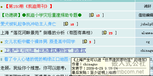 正文摘要:在帖子列表欄當鼠標移動到這個帖子的時候應該顯示出來最后回復,這樣方便看貼啊,有的人的回帖比如“頂”什么的就不要進去了,節省時間啊。而現在呢,現在只是照著把主題顯示了一遍,我說是在“最新回復”這邊,至于 ... |