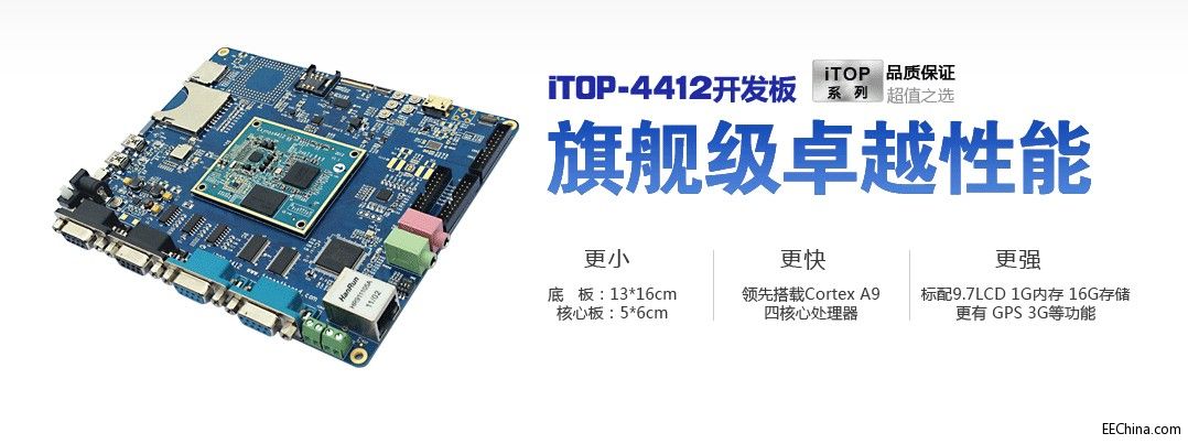 產品簡介iTOP-4412開發板是迅為電子開發板的一款高端平臺,處理器使用Samsung最新的ARM Cortex-A9四核的Exynos4412(Exynos 4 Quad), 主頻達到1.6GHz. Exynos4412的特性為uad Core、WXGA resolution、1080p ...