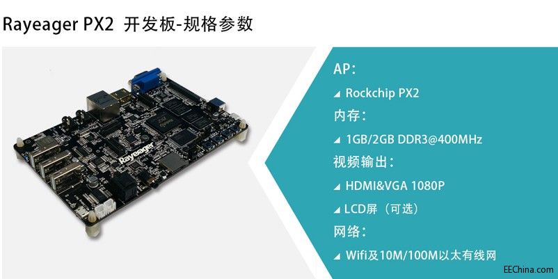 Rayeager PX2 開發板采用Rockchip PX2處理器,內置雙核ARM Cortex-A9核心,內存:1GB DDR3@400MHz,最高運行頻率1.4GHz,配備Mali-400 MP4 GPU,支持OpenGL ES 1.1/2.0和OpenVG 1.1,同時支持ARM DS-5 Streamline性能 ...