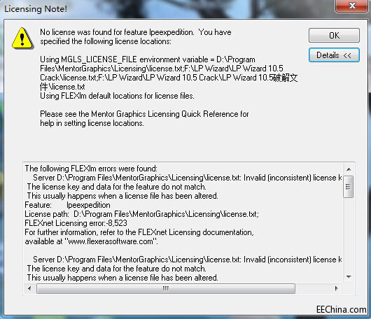 今天剛解決這個問題,64位 win 7 系統 ,安裝后跟你的提示一模一樣,不過,我考濾到有可能是license的路徑有錯誤 ,所有重新弄了一下環境變量,然后重啟一下電腦就OK了。 設置方法:我的電腦-右擊屬性-高級系統設置-高級-環境變量-在系統變量中添加: 變量名:MGLS_LICENSE_FILE 變量值為:D:\MentorGraphics\10.5LPW\SDD_HOME\LPWizard\license.txt 然后確定即可 |