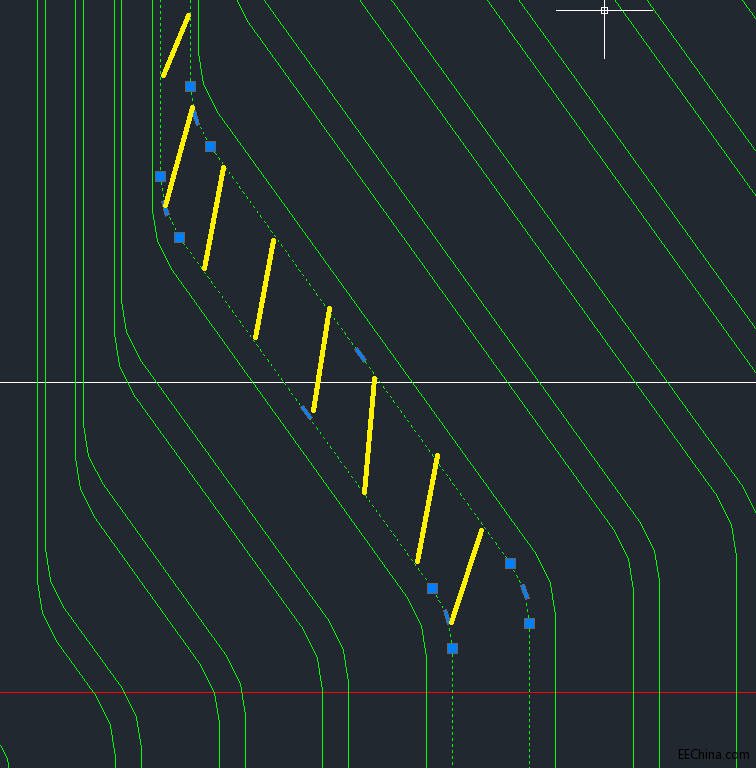 最近在做一個FPC ,走線是圖片的樣子(虛線區(qū)域是走線),我現(xiàn)在用ALlegro實在沒辦法走出這種效果,只能用shape,但是!!!有很多這樣的線,有誰知道這個是怎么做的??? 太崩潰了