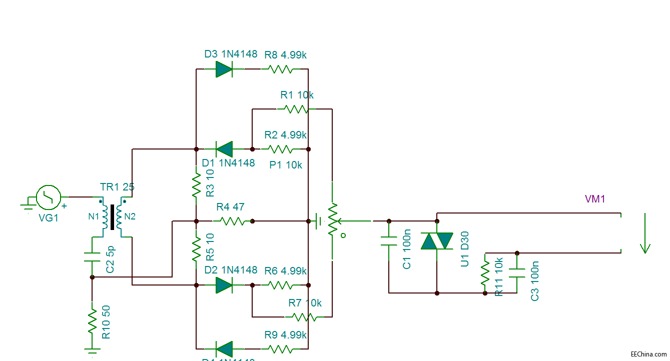 VG1為3KW、13.56Mhz的射頻信號,接到1:25的變壓器上,如果在50歐姆阻抗匹配的情況下VM1輸出是多少?如果射頻信號不是阻抗匹配的情況下(即電壓和電流有相位差)VM1輸出是多少?