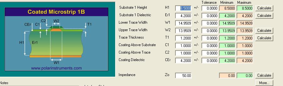 要求50Ω的阻抗,433MHz, 板材FR4,1.6mm的,銅箔厚度1OZ,請問如何計算走線線寬?
