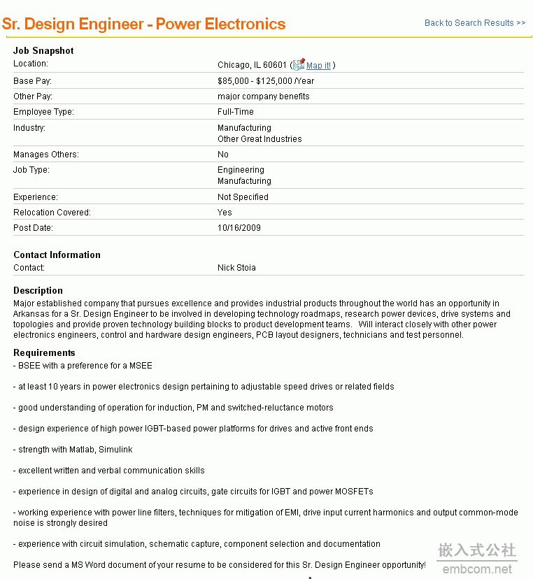 資深功率電子工程師 注:米國工程師沒有通用職稱,如我朝的教授級高工啥的。即使是大學的職稱也不通用。你在這 所大學是教授(教授很難混的,你一輩子也不定能混個教授,有的系甚至一個正教授都沒有), 到另外一所大學還不一定是什么。所以這里把senior engineer翻譯成資深工程師,而不叫高級工 程師,以免混淆。 地點:伊利諾斯州芝加哥,郵編60601 注:這是標準的地址寫法,城市、州、郵編。注意標點符號的用法。順序和我國相反。郵編很有 用的,輸入這個數字可以在一些網站方便地查到很多數據,如房價、工資水平、人口結構等。 基本工資: 其他薪金: 主要的公司福利 雇傭類型:全職 注:兼職叫part-time,沒有公司福利,如個人及家庭醫療保險、401K等 所屬行業:制造業 管理其他員工:否 工作類型:工程 制造 工作年限:未規定 報銷搬家費:是 發布日期:2009年10月16日 注:米國的日期格式比較特殊,是月、日、年。歐洲是日、月、年。 聯系人:Nick Stola 描述 本公司追求卓越,為全球提供工業產品,是大型老牌公司,現在于阿肯色有一個資深工程師工作 機會,職責是開發技術路線圖、研究功率器件、驅動系統和拓撲,以及為產品開發團隊提供成熟 技術組件。該員工將于其他功率電子工程師、控制和硬件設計工程師、PCB布局工程師、技師和 測試人員緊密協作。 要求 - 電子工程學士,最好有電子工程碩士學位 注:BSEE,Bachelor of Science in Electrical (or Electronics) Engineering - 至少10年的可變速驅動或相關領域的功率電子設計經驗 - 對電磁感應脈寬調制和開關磁阻電機有深刻了解 - 有基于IBGT電源平臺的驅動和主動前端高功率設計經驗 - 熟練掌握Matlab和Simulink - 精通書面和口頭交流技巧 - 有數字和模擬電路、IGBT和功率MOSFET門電路設計經驗 - 有電力線濾波實際工作經驗、EMI、驅動輸入電流諧波和輸出共模噪音降低技能更佳 - 有電路仿真經驗、schematic capture選件和文檔記錄經驗 注:注意對各種技能的要求程度用詞:experience, understanding, work experience, strength, excellence。有的需要你了解,有的需要精通,有的需要實際工作經驗 |