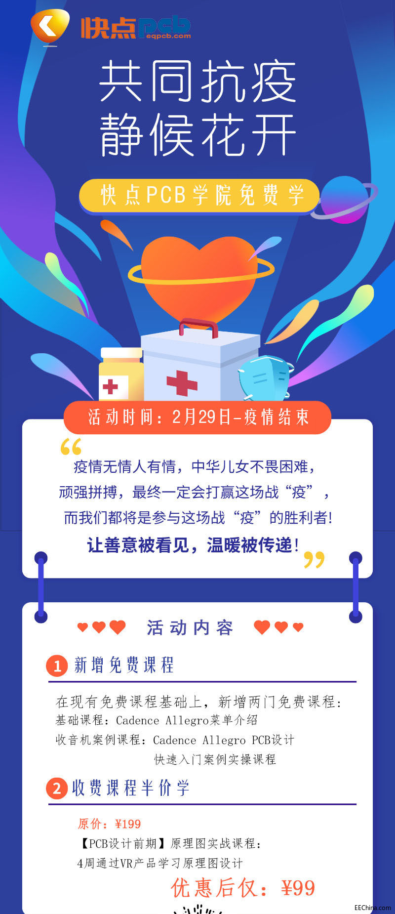 為了響應國家號召,疫情期間不聚集,防止發生感染,快點學院聯合騰訊課堂,繼續開放部分課程免費供大家在線學習,希望大家既能安心防范病毒,也能放心提升技能。 大家可以在“騰訊課堂”搜索【快點PCB學院 ...