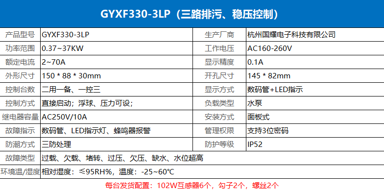 GYXF330-3LP三路排污、穩壓控制器,是應市場需求推出的一款高性能產品,主要用于排污泵、穩壓泵、給水泵等控制。本裝置用于水泵控制設備中的邏輯運算、自動遠程信號處理、接觸器驅動、電壓電流顯示及負載故障保護切 ...