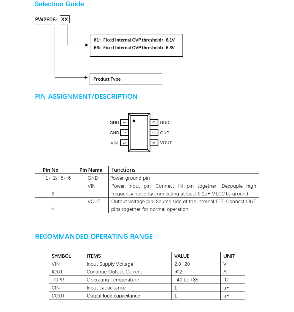 PW2606是一種前端過電壓和過電流保護裝置。它實現了廣泛的輸入電壓范圍從2.5V到40V。過電壓閾值可在外部編程或設置為內部默認設置。集成功率路徑nFET開關的超低電阻確保了更好的性能電池充電系統應用的性能。它可以 ...