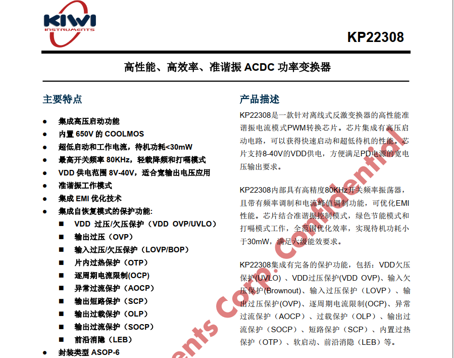 KP22308是一款針對(duì)離線式反激變換器的高性能準(zhǔn)諧振電流模式PWM轉(zhuǎn)換芯片。芯片集成有高壓?jiǎn)?dòng)電路,可以獲得快速啟動(dòng)和超低待機(jī)的性能。芯片支持8-40V的VDD供電,方便滿足PD電源的寬電壓輸出要求。 KP22308內(nèi)部具有 ...