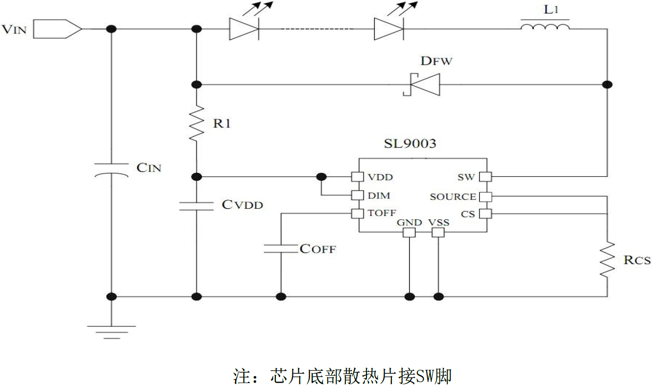 概述 SL9003 是一款內置100V 功率MOS 高效率、高精度的開關降壓型大功率LED 恒流驅動芯片。 SL9003 采用固定關斷時間的峰值電 流控制方式,關斷時間可通過外部電容進 行調節,工作頻率可根據用戶要求而改變。 ...