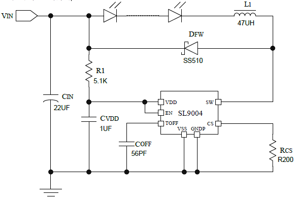 概述 SL9004 是一款高效率,降壓型高亮 度LED 燈恒流驅動芯片。內置100V/12A 功率MOS 管,尤其適合寬輸入電壓范圍 的LED 驅動。 SL9004 采用固定關斷時間的峰值電 流控制方式,其工作頻率最高可達1MHz, 可使 ...