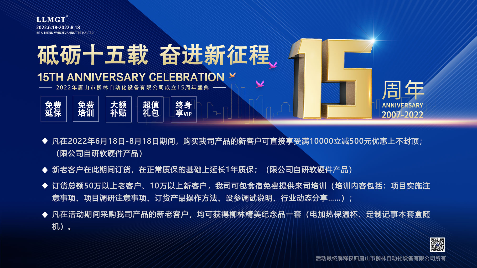 正文摘要:熱烈慶祝唐山柳林成立15周年,一直在關(guān)注唐山柳林產(chǎn)品的朋友們,周年慶活動(dòng)來(lái)了,抓緊登錄我公司網(wǎng)站 (tangshanliulin.net)聯(lián)系我公司銷售人員吧,福利多多,千萬(wàn)別錯(cuò)過(guò)哦!15周年感恩回饋:1、凡在本年度6月18日-8月 ... |