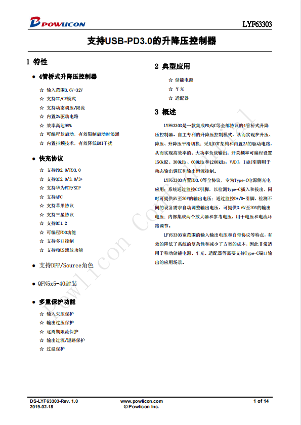 概述: LYF63303是一款集成PD/QC等全部協議的4管橋式升降壓控制器。自主專利的升降壓控制模式,從而實現在升壓、 降壓、升降壓平滑切換;采用COT架構和內置2A的驅動電路,從而實現高效率的、大功率負載輸出 ...