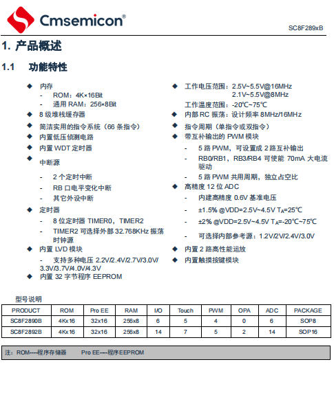 SC8F2892B是中微FLASH芯片,Flash4Kx14Bit、RAM256B,內置RC振蕩8MHz/16MHz,工作電壓2.5V-5.5V,GPIO最多14個,內置觸摸按鍵功能,內置WDT、LVD、高精度12位ADC、2路運算放大器、提供5路PWM。 產品特性 >工作電 ...