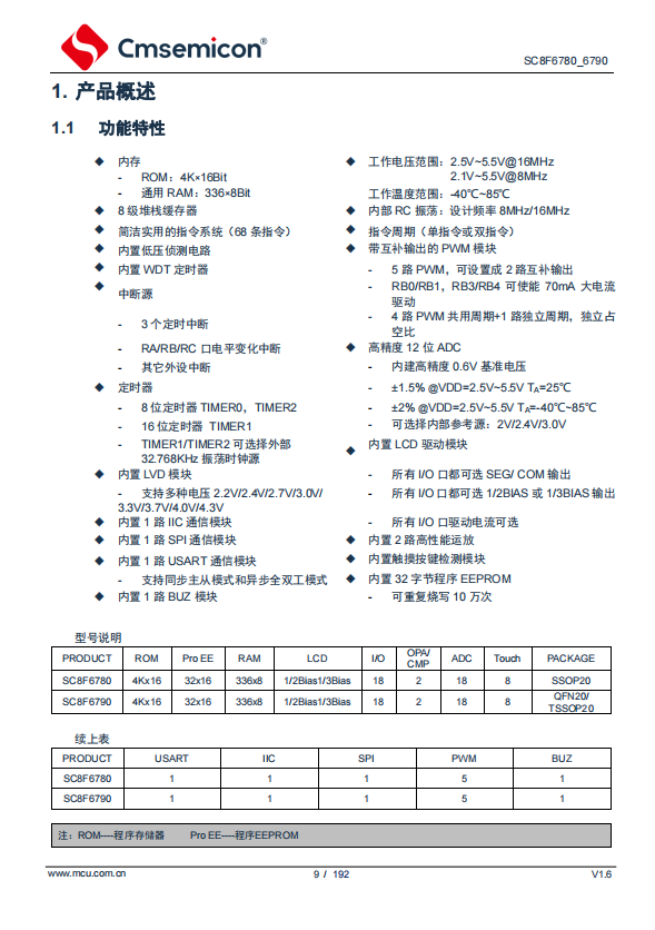 SC8F6790是中微FLASH芯片,Flash 4Kx16Bit、RAM336B,內置RC振蕩8MHz/16MHz,工作電壓2.1V-5.5V,GPIO最多18個,內置觸摸按鍵功能,內置WDT、LVD、BUZ、高精度12位ADC、2路運算放大器、內置 LCD 驅動模塊、內置US ...
