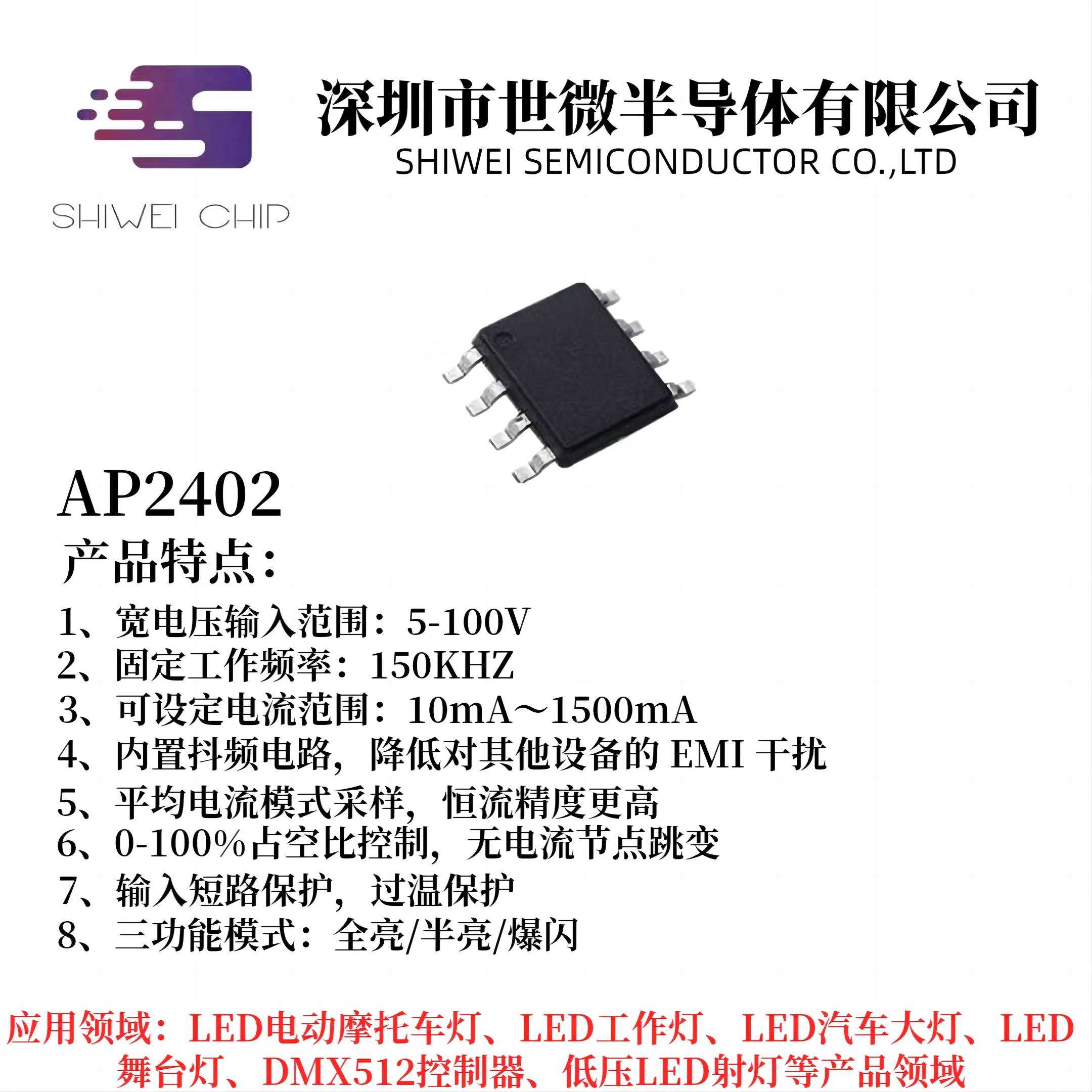 產品描述 AP2402 是一款 PWM 工作模式,高效率、外圍簡單、內置功率管,適用于 5-100V 輸入的高精度降壓 LED 恒流驅動芯片。輸出最大功率可達 15W,最大電流 1.5A。 AP2402 可實現三段功能切換,通過 MODE1/2/3 切 ...