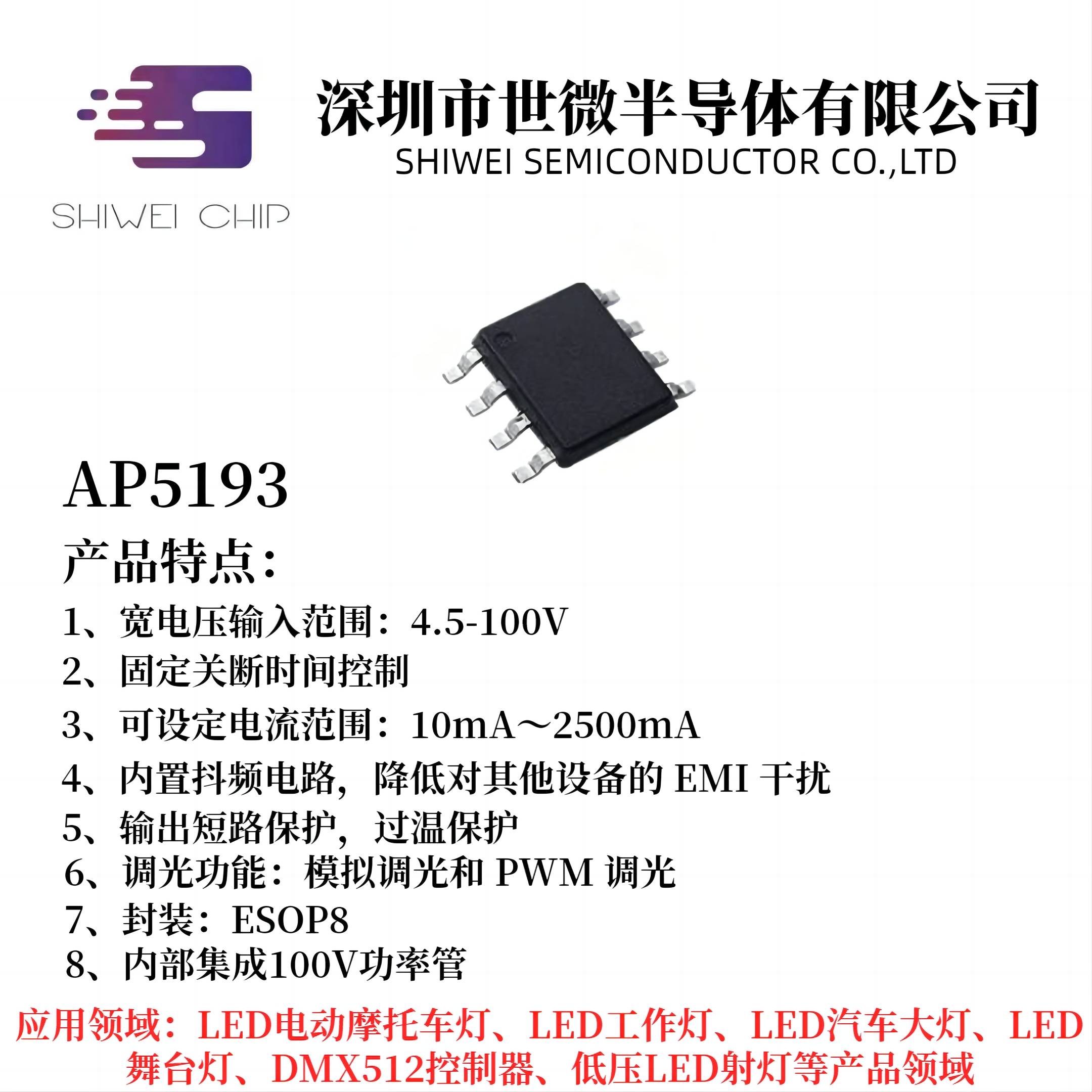 AP5193是一款PWM工作模式,高效率、外圍簡單、內置功率MOS管,適用于4.5-100V輸入的高精度降壓LED恒流驅動芯片。最大電流2.5A。 AP5193可實現線性調光和PWM調光,線性調光腳有效電壓范圍0.55-2.6V. AP5193 工作頻率 ...