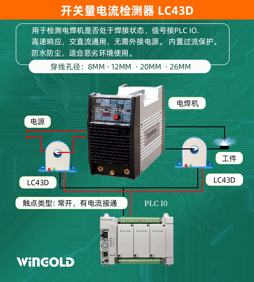 第三代開關量電流檢測器LC43D用于電焊機焊接狀態(tài)檢測,輸出信號接PLC IO。 無需單獨電源,交直流通用。防水防塵,適合惡劣環(huán)境使用。 最大電流8mm 200a , 12mm 400a , &nb ...