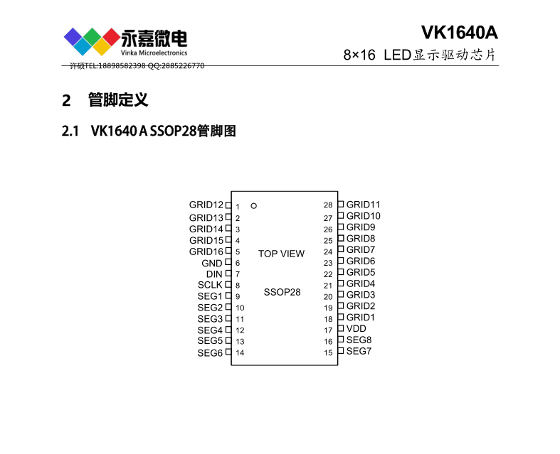 產品品牌:永嘉微電/VINKA 產品型號:VK1640A 封裝形式:SSOP28 概述:VK1640A是一種數碼管或點陣LED驅動控制專用芯片,內部集成有數據鎖存器、LED驅動等電路。SEG腳接LED陽極,GRID腳接LED陰極,可支持8SEGx16GRI ...