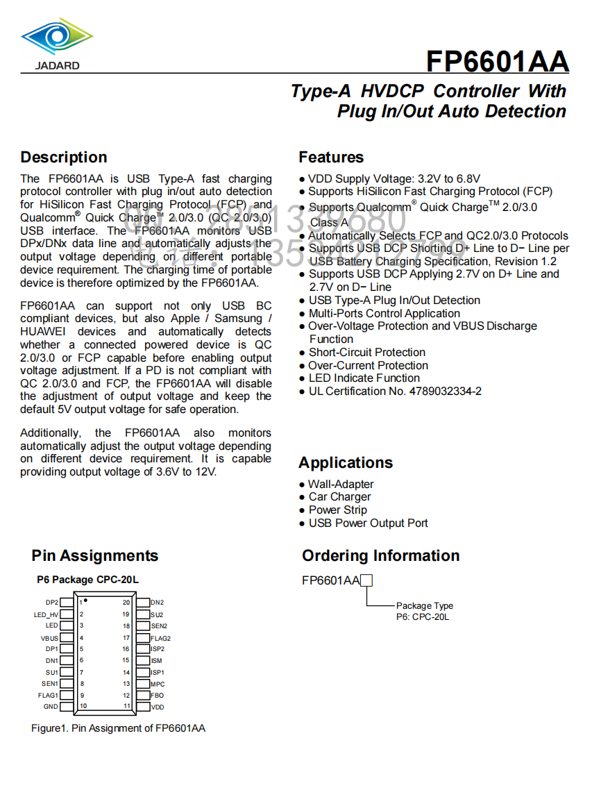 概述 FP6601AA是USB類型-一種快速充電協(xié)議控制器,插入/出自動檢測高通硅快速充電協(xié)議(FCP)和高通®快速ChargeTM 2.0/3.0(QC 2.0/3.0)USB接口。FP6601AA監(jiān)控USB DPx/DNx數(shù)據(jù)線,并根據(jù)不同的便攜式設備需求 ...