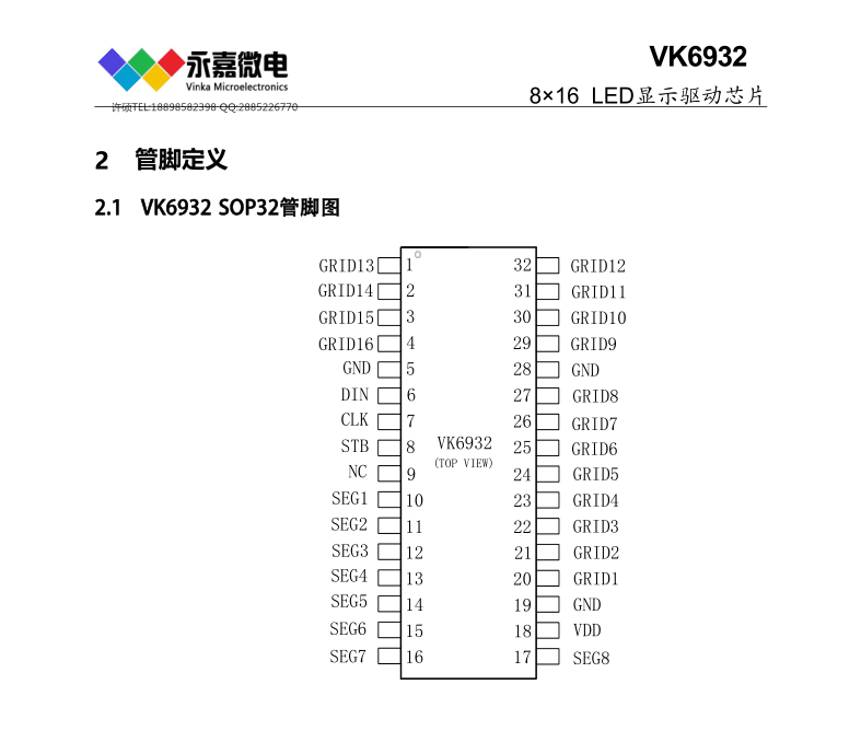產(chǎn)品品牌:永嘉微電/VINKA 產(chǎn)品型號(hào):VK6932 封裝形式:SOP32概述VK6932是一種數(shù)碼管或點(diǎn)陣LED驅(qū)動(dòng)控制專(zhuān)用芯片,內(nèi)部集成有3線串行接口、數(shù)據(jù)鎖存器、LED 驅(qū)動(dòng)等電路。SEG腳接LED陽(yáng)極,GRID腳接LED陰極,可支持8S ...