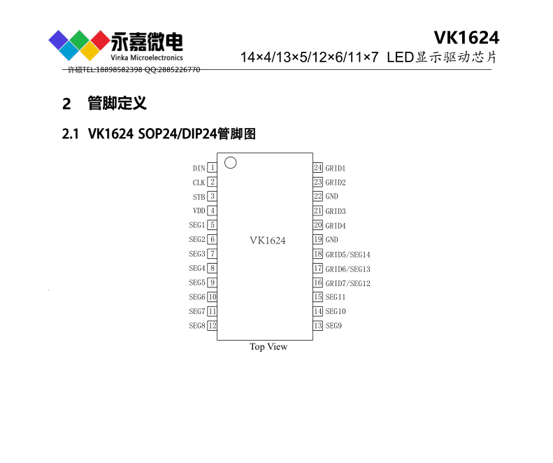 產品品牌:永嘉微電/VINKA 產品型號:VK1624 封裝形式:SOP24 概述VK1624是一種數碼管或點陣LED驅動控制專用芯片,內部集成有3線串行接口、數據鎖 存器、LED 驅動等電路。SEG腳接LED陽極,GRID腳接LED陰極,可支持 ...