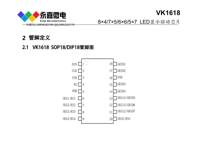 產(chǎn)品品牌:永嘉微電/VINKA產(chǎn)品型號:VK1618封裝形式:SOP18/DIP18 概述VK1618是一種帶鍵盤掃描接口的數(shù)碼管或點陣LED驅(qū)動控制專用芯片,內(nèi)部集成有3線串行接口、數(shù)據(jù)鎖存器、LED 驅(qū)動、鍵盤掃描等電路。SEG腳接LED陽 ...