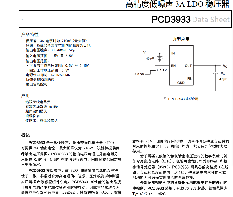 概述PCD3933 是一款低噪聲、低壓差線性穩(wěn)壓器 (LDO),可提供 3A 輸出電流,最大壓降僅為 210mV。該器件提供兩種輸出電壓范圍。 PCD3933 的輸出電壓可通過外部電阻分壓器在 0.5V 至 5.15V 范圍內(nèi)進行調(diào)節(jié),同時還提供 ...