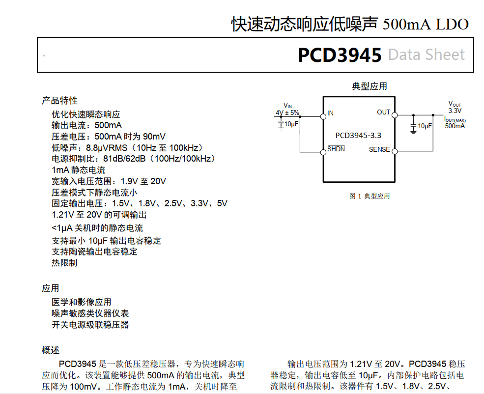 概述(替代LT1763)PCD3945 是一款低壓差穩壓器,專為快速瞬態響應而優化。該裝置能夠提供 500mA 的輸出電流,典型壓降為 100mV。工作靜態電流為1mA,關機時降至1μA 以下,同時壓差模式下靜態電流控制良好。除了快速 ...