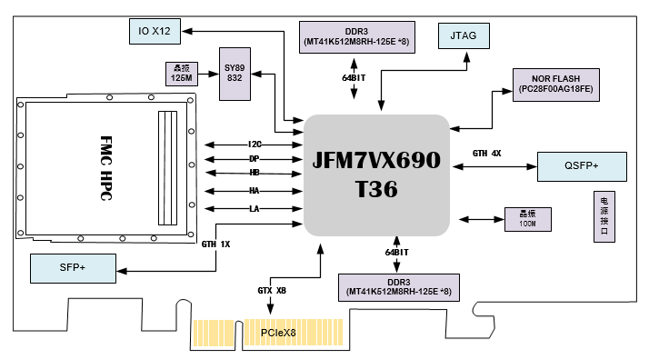 一、板卡概述 本板卡基于FPGA JFM7VX690T36 芯片,支持PCIeX8、兩組 64bit DDR3容量8GByte,HPC的FMC連接器,板卡支持各種FMC子卡擴展。軟件支持windows,Linux操作系統。 & ...