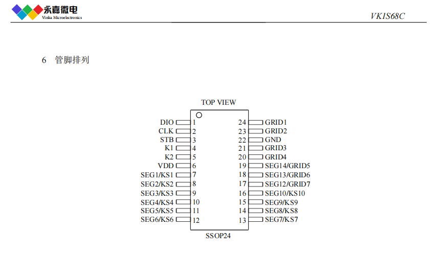 VK1S68C SSOP24可支持13×4的點(diǎn)陣LED顯示面板/LED數(shù)顯驅(qū) ...