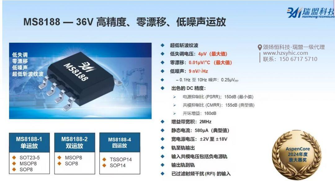 產品簡述: MS8188是一款36V高精度低噪聲的運算放大器。采用高 壓斬波技術來實現零溫漂的特性。與同類產品相比,斬波頻率 諧波上的毛刺大幅度減小。出色的DC精度還包括高電源抑制 比、高共模抑制比和高開環增 ...