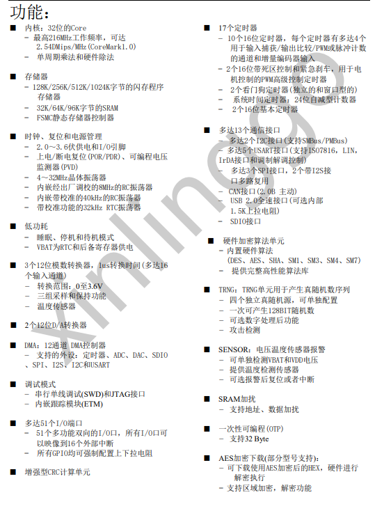 MH32F103Axxxx系列使用高性能的32位內核,最高工作頻率216 MHz。內置的存儲器包括:最大1024KFlash,96K Sram。該系列內置了多達2個高級定時器、10個通用定時器、2個基本定時器、3個12位的ADC、2個12位的DAC,還包含 ...