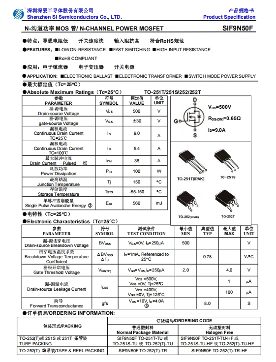 代理深愛半導體 高壓MOS管場效應管 SIF9N50F 封裝TO-251T&251S&252&252T ●特點:導通電阻低 開關速度快 輸入阻抗高 符合RoHS規(guī)范 ●FEATURES:■LOW ON-RESISTANCE ■FAST SWITCHING ■HIGH INPUT ...