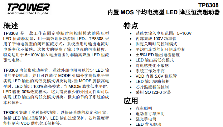 概述 TP8325 是一款工作在固定關斷時間控制模式的降壓型LED 恒流驅動器,用于高效地驅動多顆 LED。 TP8325 采用平均電流型的閉環恒流方式,系統應用時輸出電流對電感變化不敏感。這極大的提高了輸出電流的恒流精度 ...
