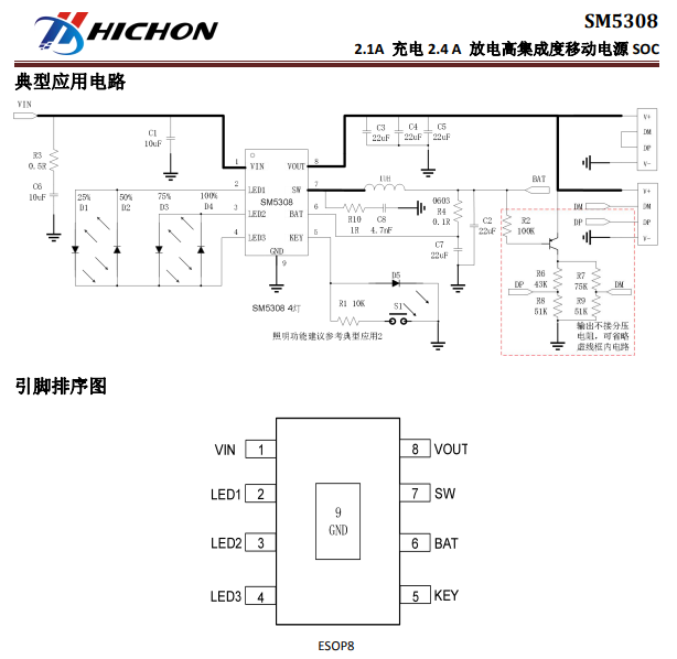SM5308 是一款集成升壓轉換器、鋰電池充電管理、電池電量指示的多功能電源管理 S0C,為移動電源提供完整的電源解決方案。 SM5308 的高集成度與豐富功能,使其在應用時僅需極少的外圍器件,并有效減小整體方案的尺寸, ...