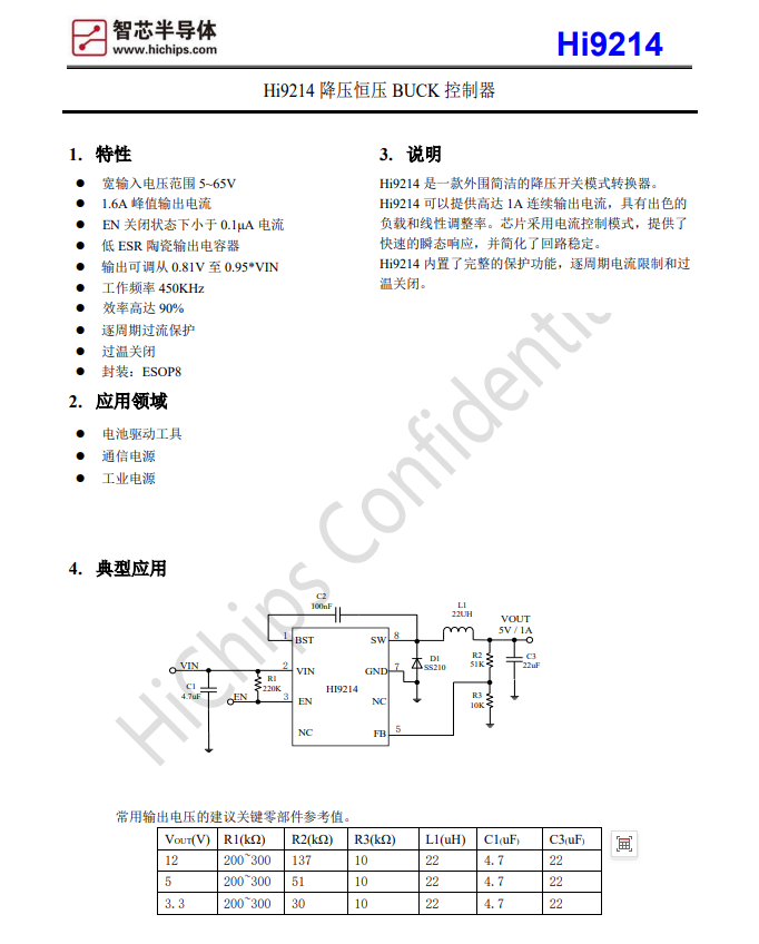 Hi9214高可靠性寬壓降壓開關模式轉換器聚能芯半導體智芯 ...