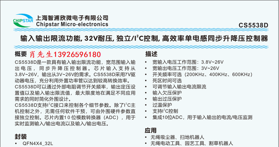 CS5538D是一款具有輸入輸出限流功能,寬范圍輸入輸出電壓,同步升降壓控制器。芯片輸入支持從3.8V~26V,輸出從3V~26V的需求。CS5538D采用7V驅動器電壓,充分利用外置功率管以達到較高轉換效率。 CS5538D可以通過外部 ...