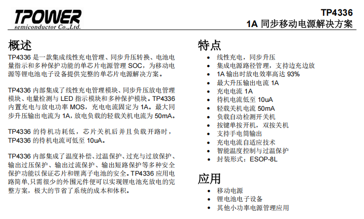 概述 TP4336 是一款集成線性充電管理、同步升壓轉換、電池電 量指示和多種保護功能的單芯片電源管理 SOC,為移動電 源等鋰電池電子設備提供完整的單芯片電源解決方案。 TP4336 內部集成了線性充電管理模塊、同步 ...