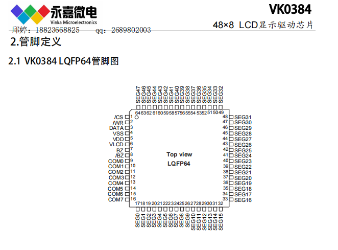 VK0384是一個點陣式存儲映射的LCD驅動器,可支持最大384點(48SEGx8COM)的LCD 屏。單片機可通過3線串行接口配置顯示參數和發送顯示數據,也可通過指令進入省電模式。LJQ6914產品品牌:永嘉微電/VINKA 產品型號:VK ...