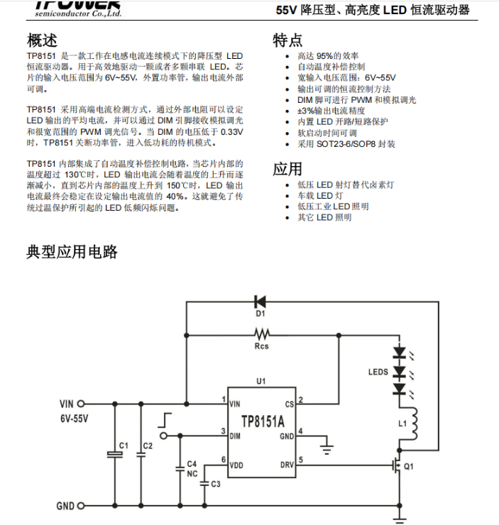 概述 TP8815 是一款工作在電感電流連續導通模式下的降壓型 LED 恒流驅動器,用于高效地驅動多顆 LED。TP8815 采 用平均電流型的閉環恒流方式,這極大的提高了輸出電流 的恒流精度,特別適用于 8~100V 輸入電壓 ...