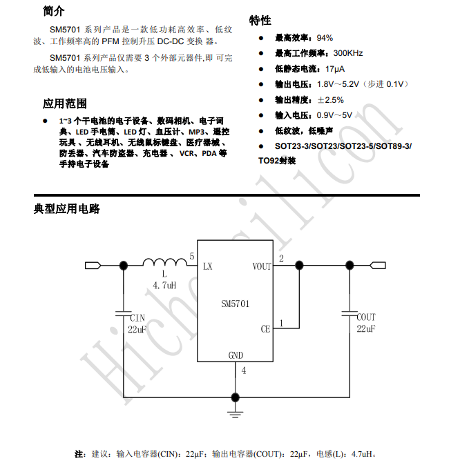 特性 最高效率:94% 最高工作頻率:300KHZ 低靜態(tài)電流:17μA 輸出電壓:1.8V~5.2V(步進(jìn) 0.1V) 輸出精度:士2.5%輸入電壓:0.9V~5V低紋波,低噪聲SOT23-3/SOT23/S0T23-51S0T89-3/TO92封裝 應(yīng)用范圍 1~3 個干電池的 ...